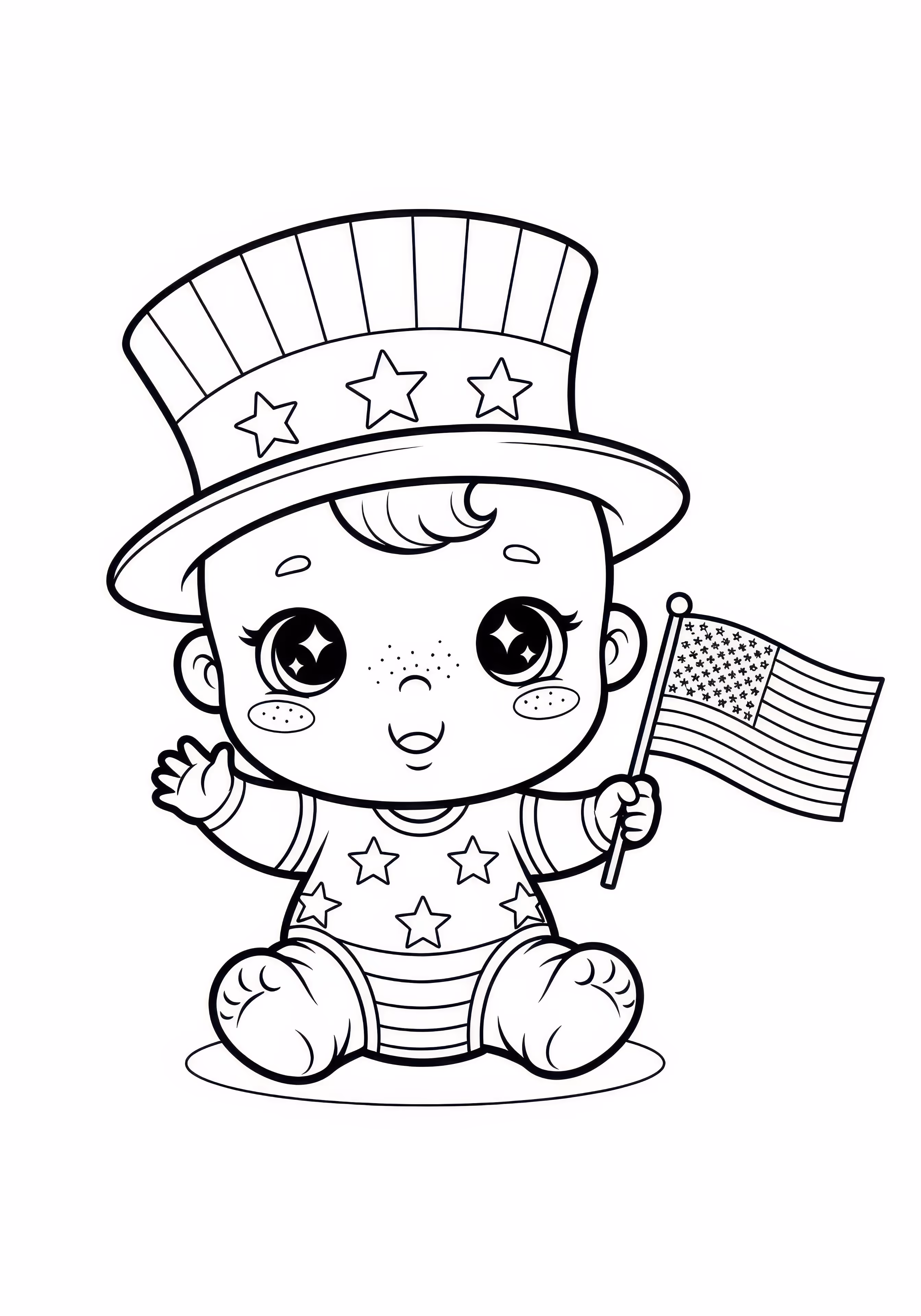 Baby Uncle Sam is a free printable coloring page designed for preschool in kawaii style. This easy difficulty coloring sheet features thick outlines, perfect for young artists.