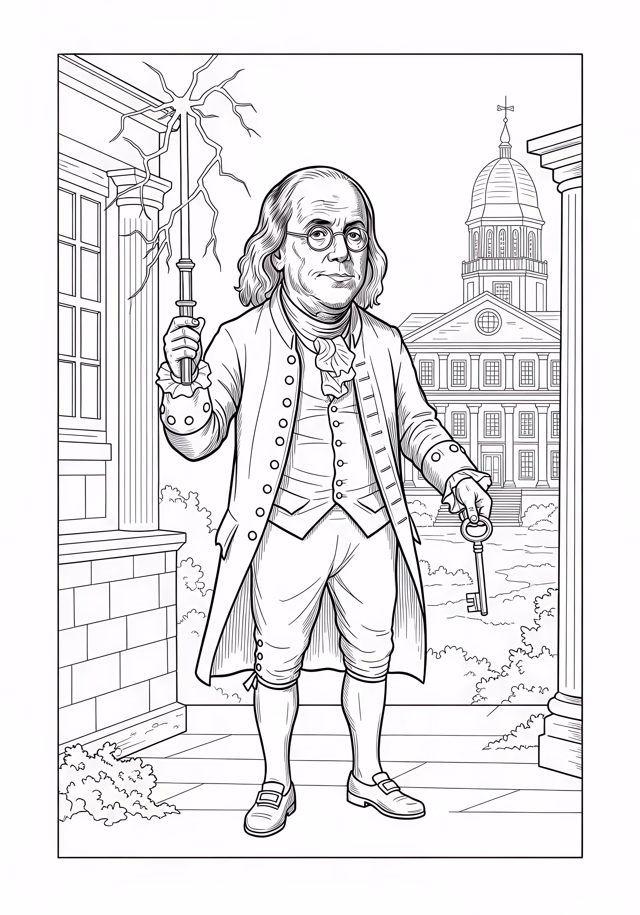 Ben Franklin is a free printable coloring page designed for tweens in historical style. This hard difficulty coloring sheet features medium outlines, perfect for young artists.