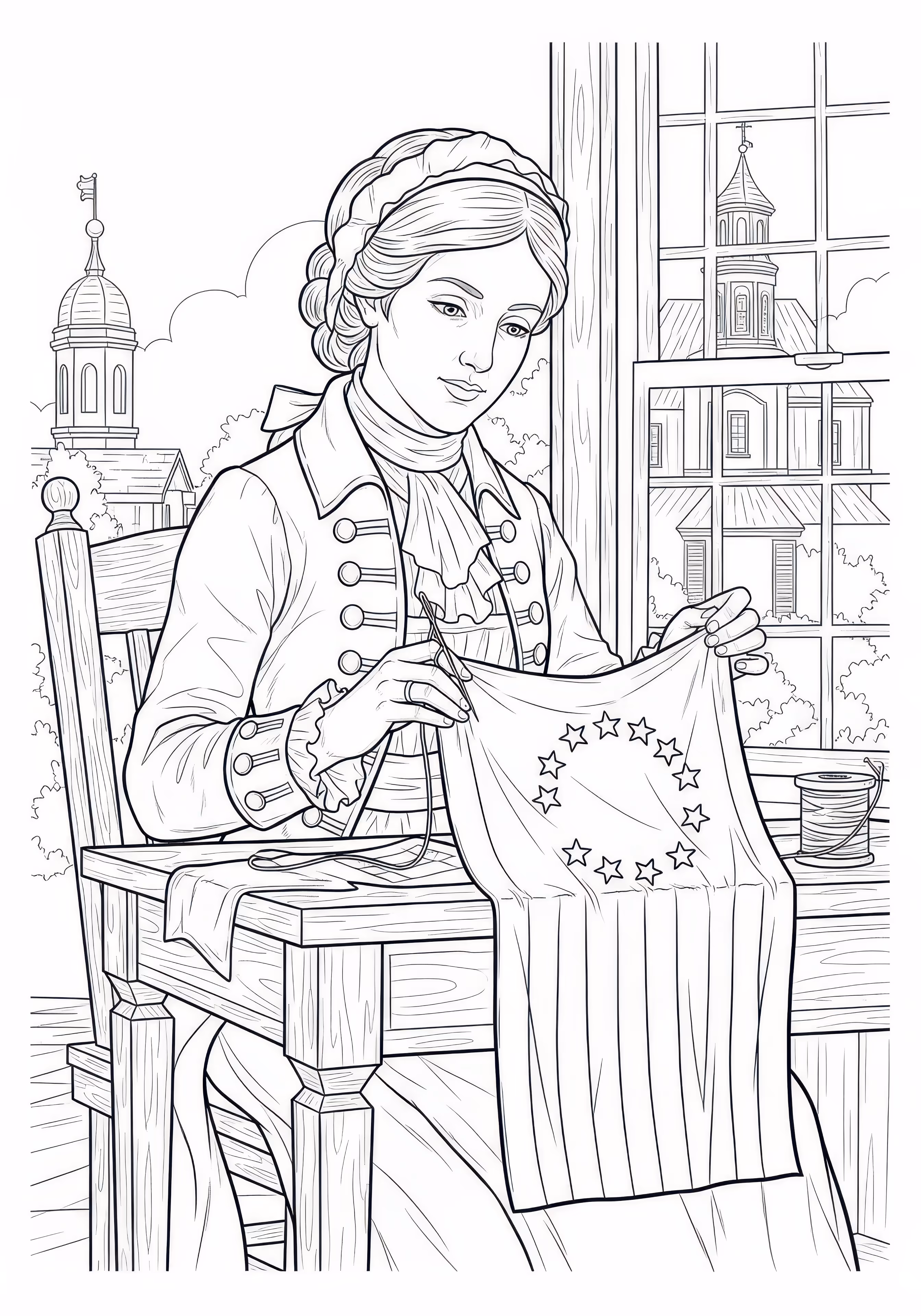 Betsy Ross is a free printable coloring page designed for tweens in historical style. This hard difficulty coloring sheet features medium outlines, perfect for young artists.
