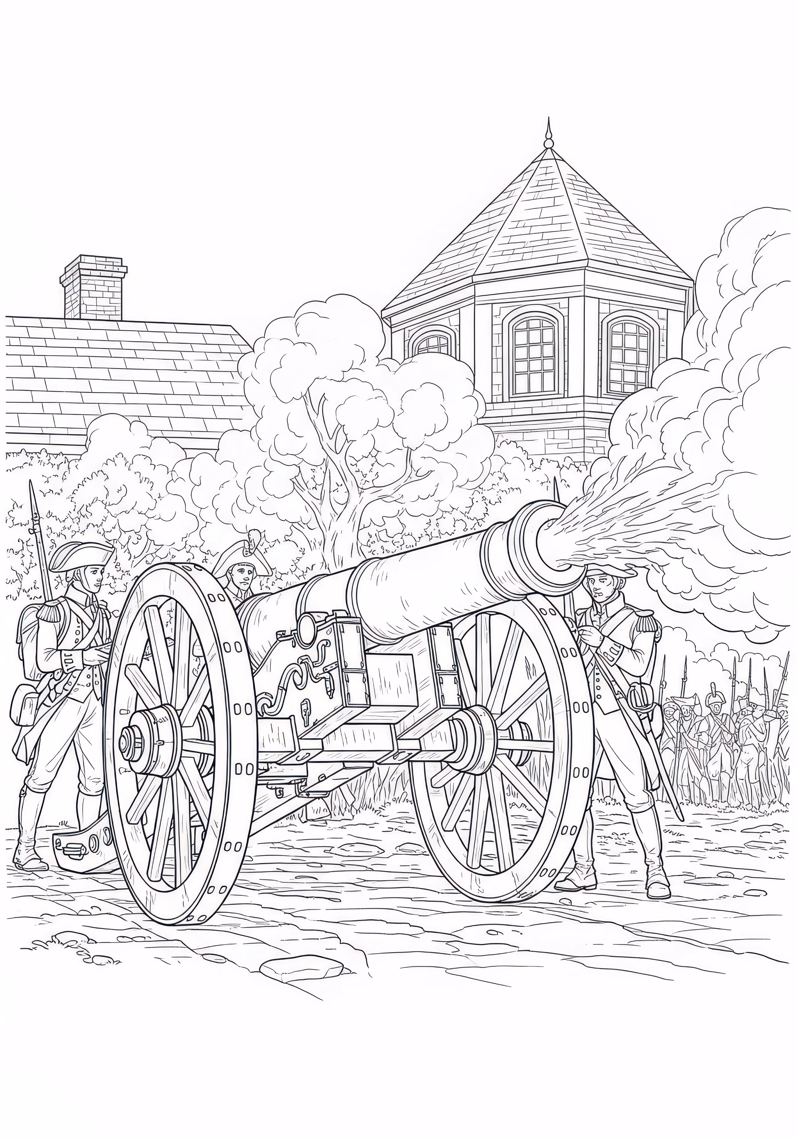 Cannon Firing is a free printable coloring page designed for tweens in historical style. This hard difficulty coloring sheet features medium outlines, perfect for young artists.