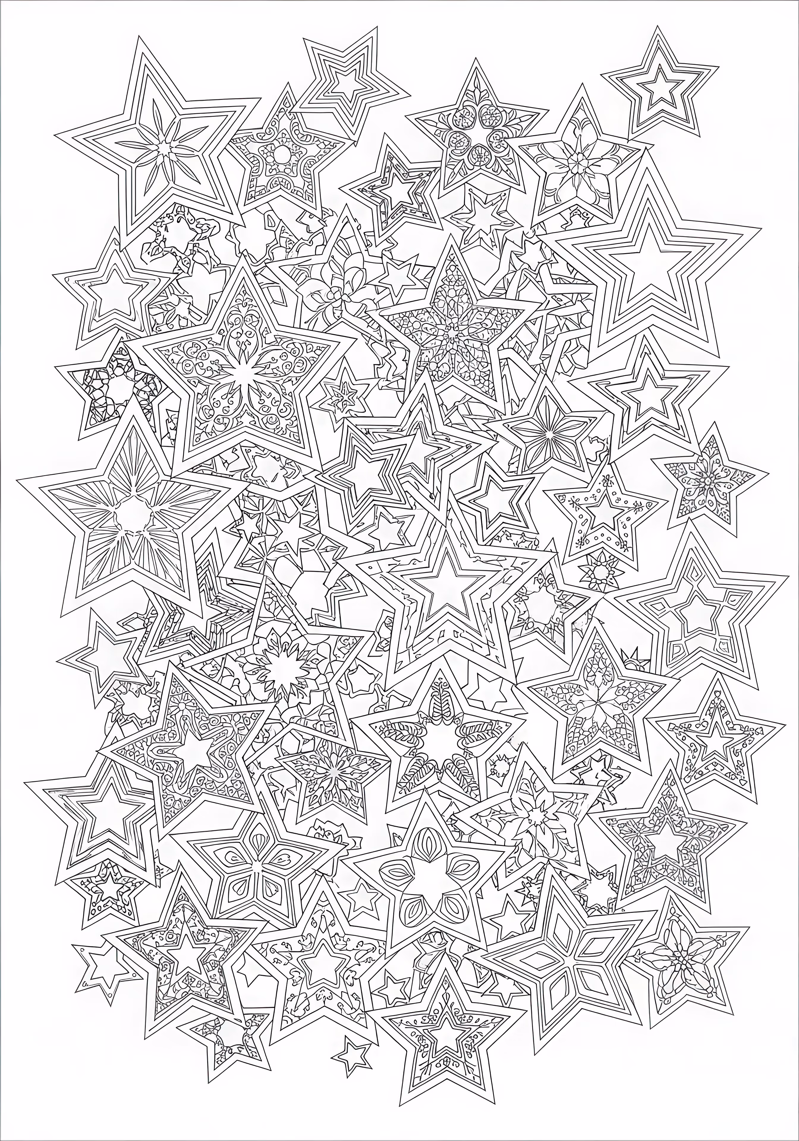 Complex Stars is a free printable coloring page designed for adults in geometric style. This very hard difficulty coloring sheet features thin outlines, perfect for young artists.