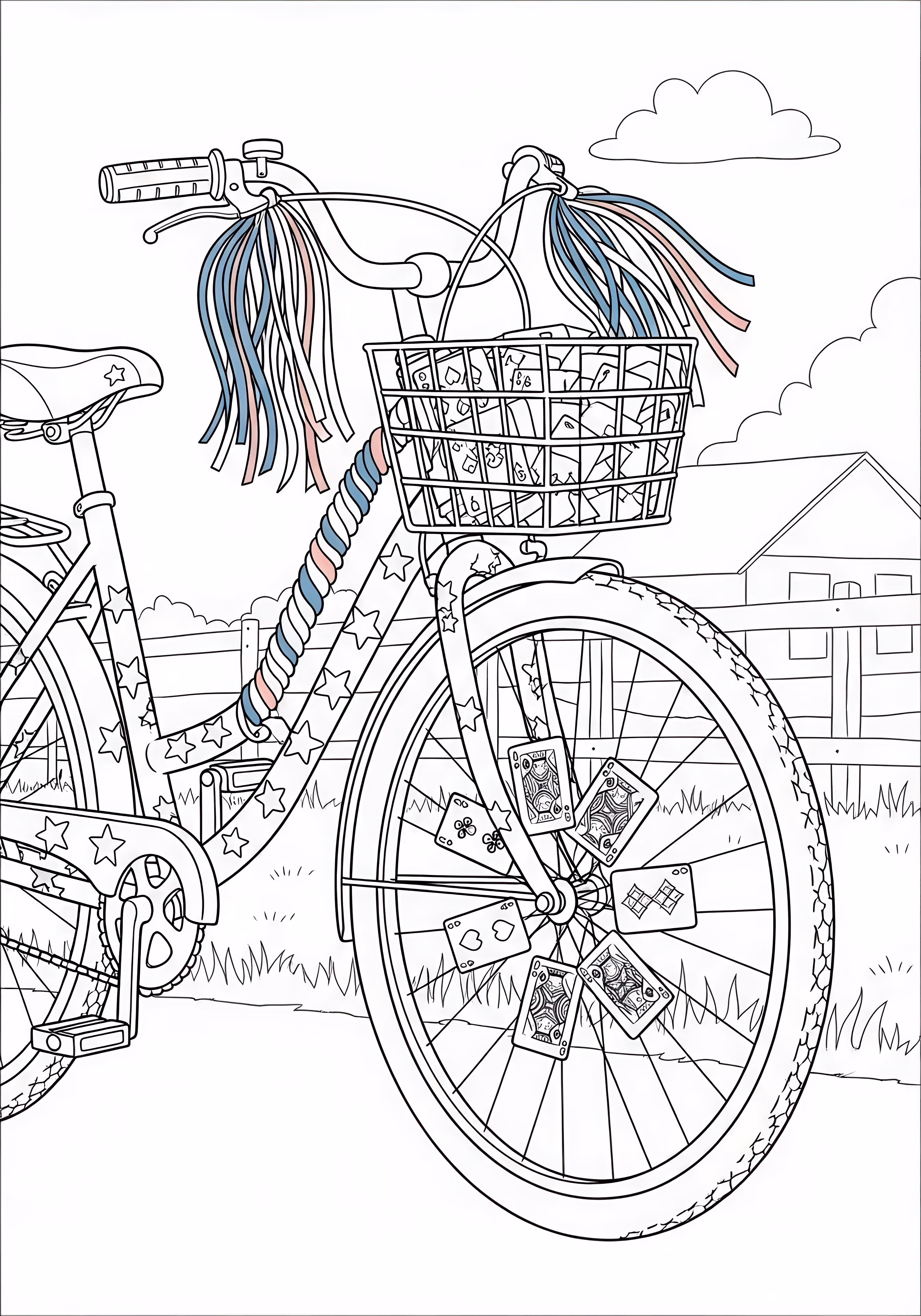 Decorated Bike is a free printable coloring page designed for kids in scene style. This medium difficulty coloring sheet features medium outlines, perfect for young artists.