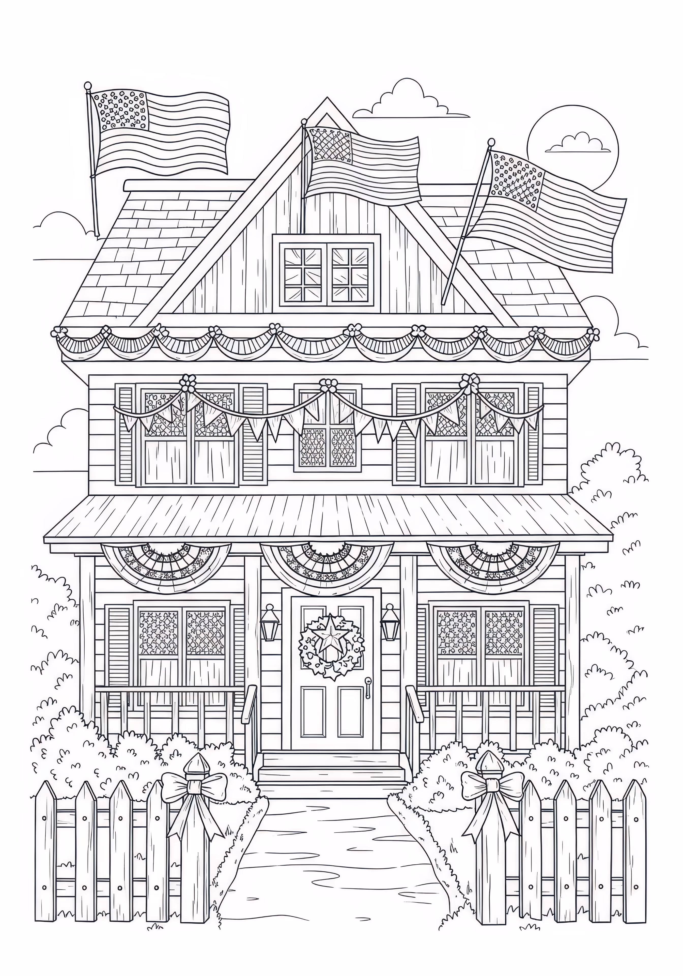Decorated House is a free printable coloring page designed for kids in scene style. This medium difficulty coloring sheet features medium outlines, perfect for young artists.