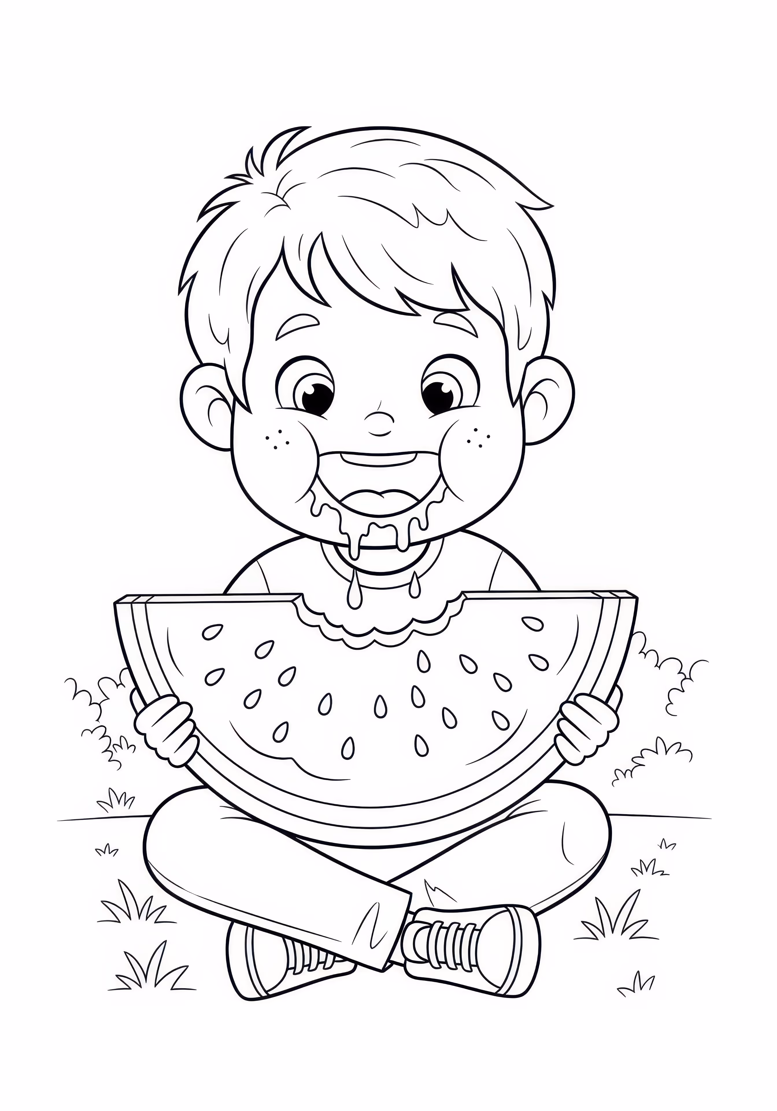 Eating Watermelon is a free printable coloring page designed for kids in cartoon style. This medium difficulty coloring sheet features medium outlines, perfect for young artists.