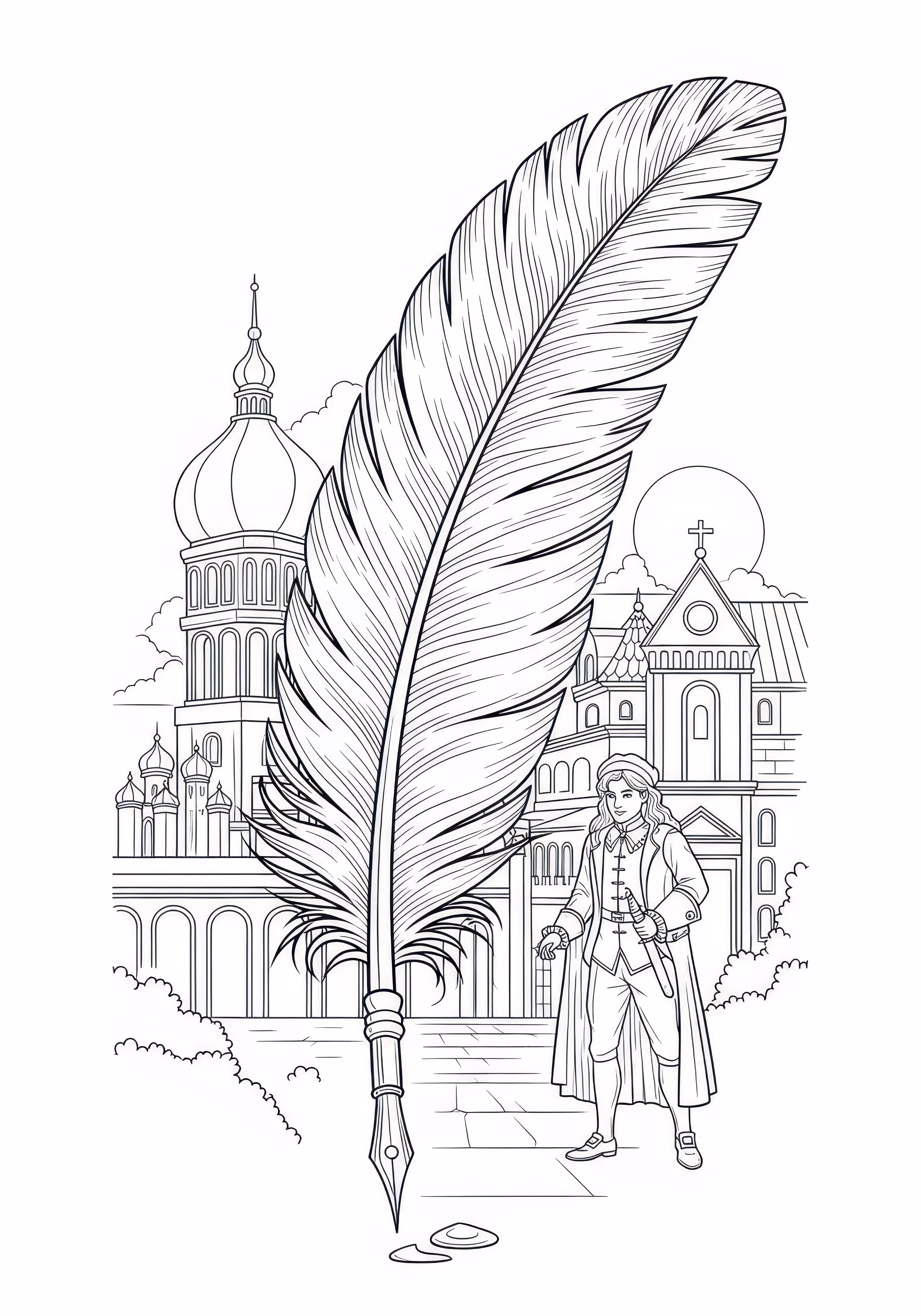 Feather Pen is a free printable coloring page designed for tweens in historical style. This hard difficulty coloring sheet features medium outlines, perfect for young artists.