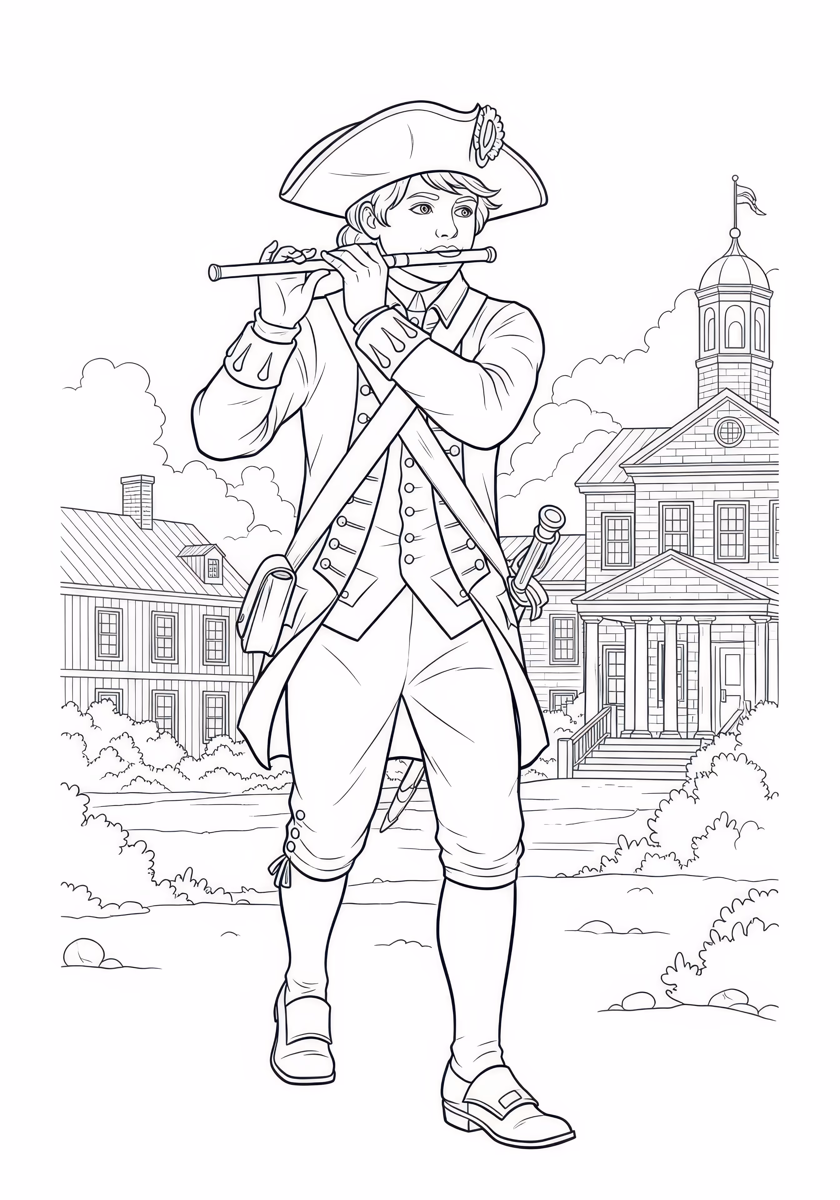 Fife Player is a free printable coloring page designed for tweens in historical style. This hard difficulty coloring sheet features medium outlines, perfect for young artists.