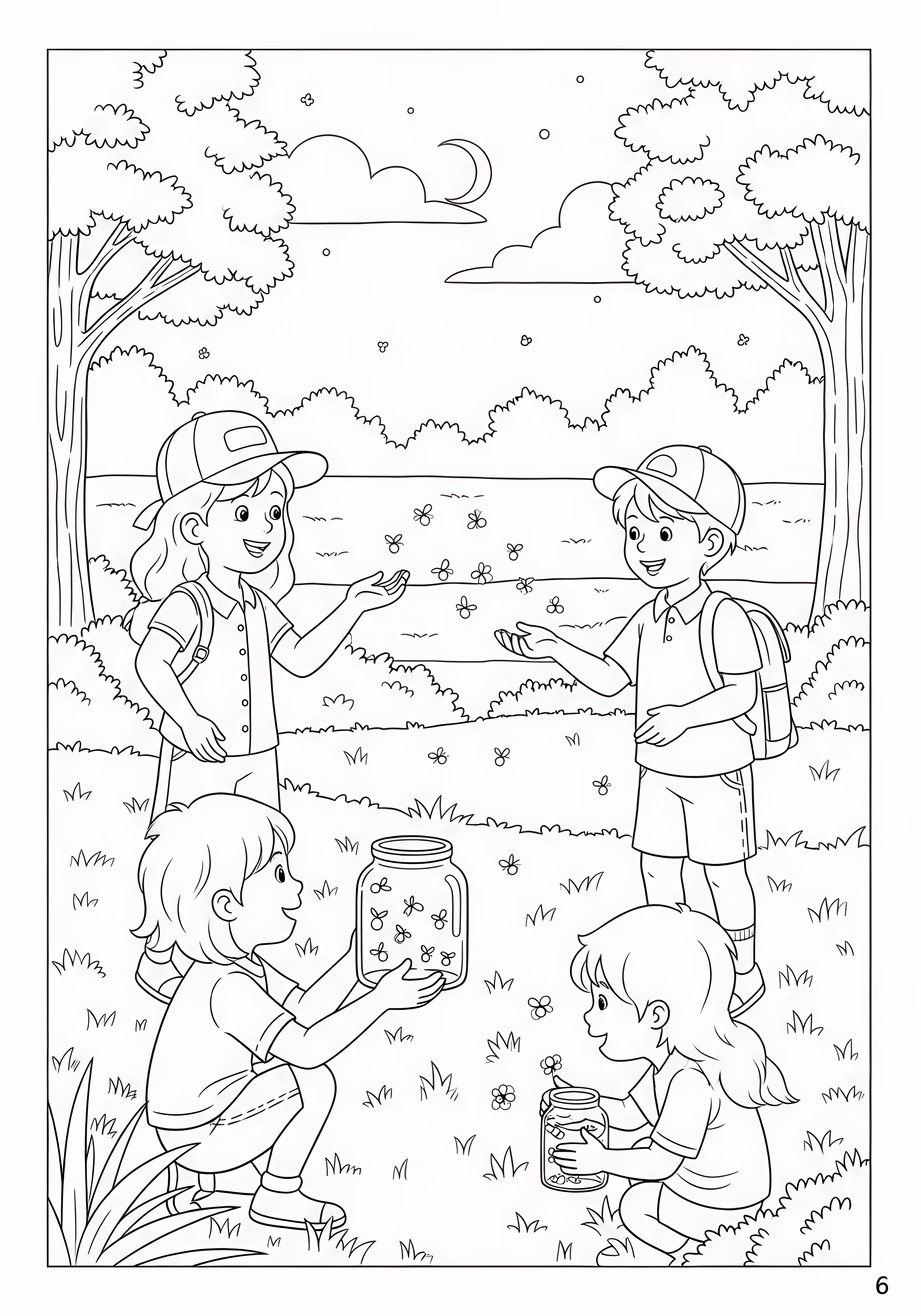 Firefly Night is a free printable coloring page designed for kids in scene style. This medium difficulty coloring sheet features medium outlines, perfect for young artists.
