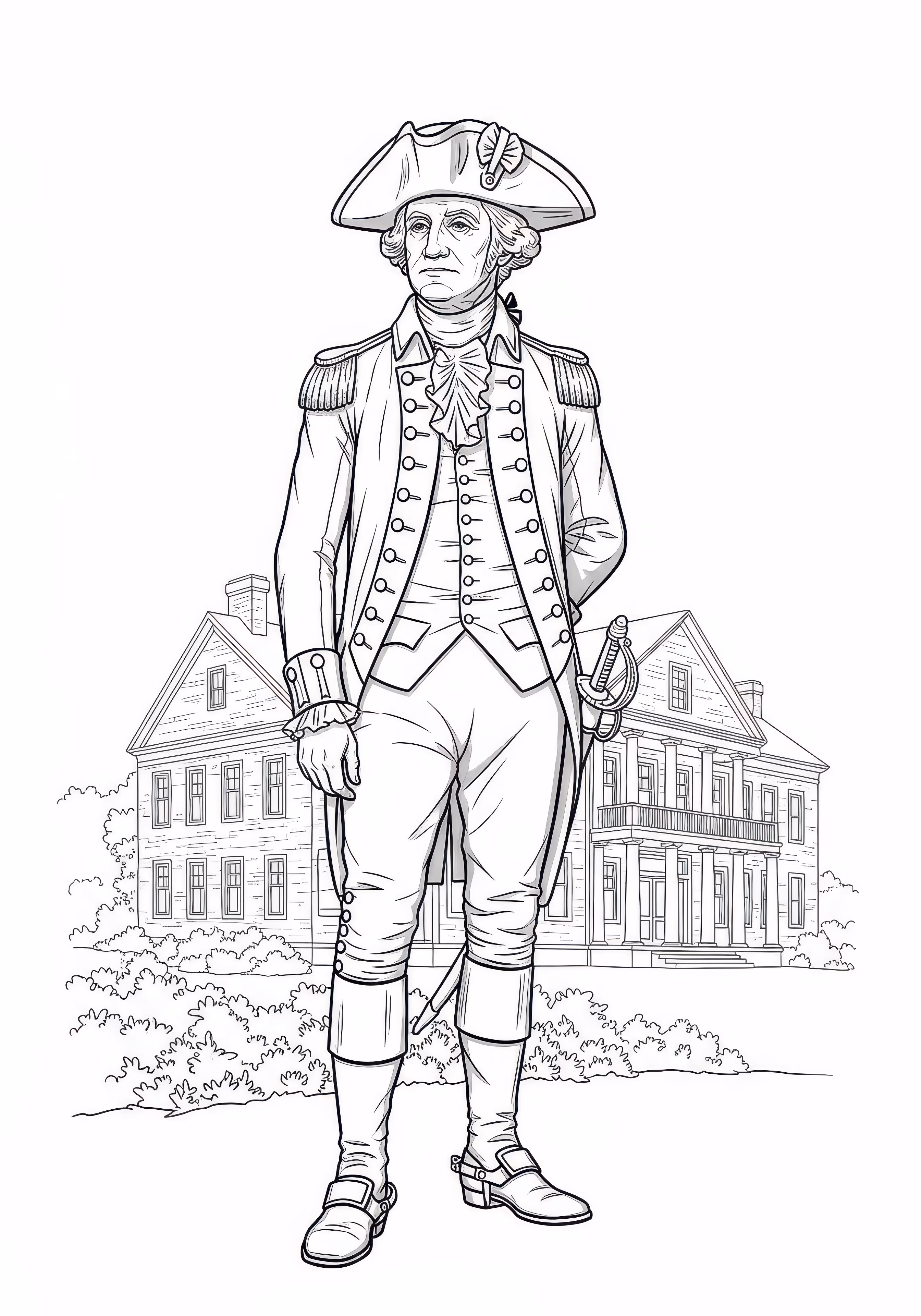 George Washington is a free printable coloring page designed for tweens in historical style. This hard difficulty coloring sheet features medium outlines, perfect for young artists.