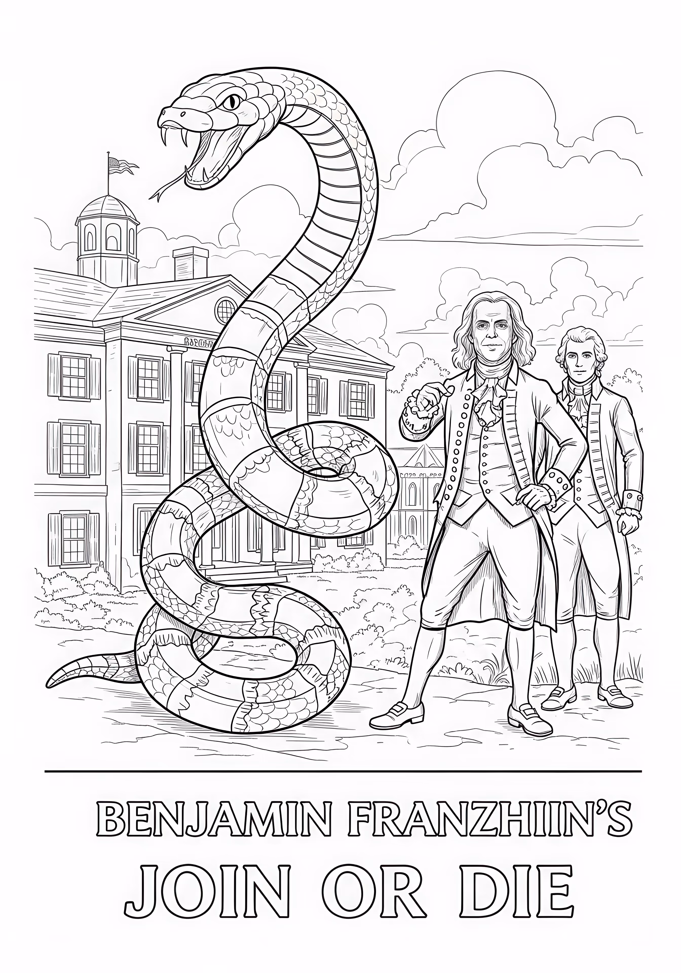 Join Or Die is a free printable coloring page designed for tweens in historical style. This hard difficulty coloring sheet features medium outlines, perfect for young artists.