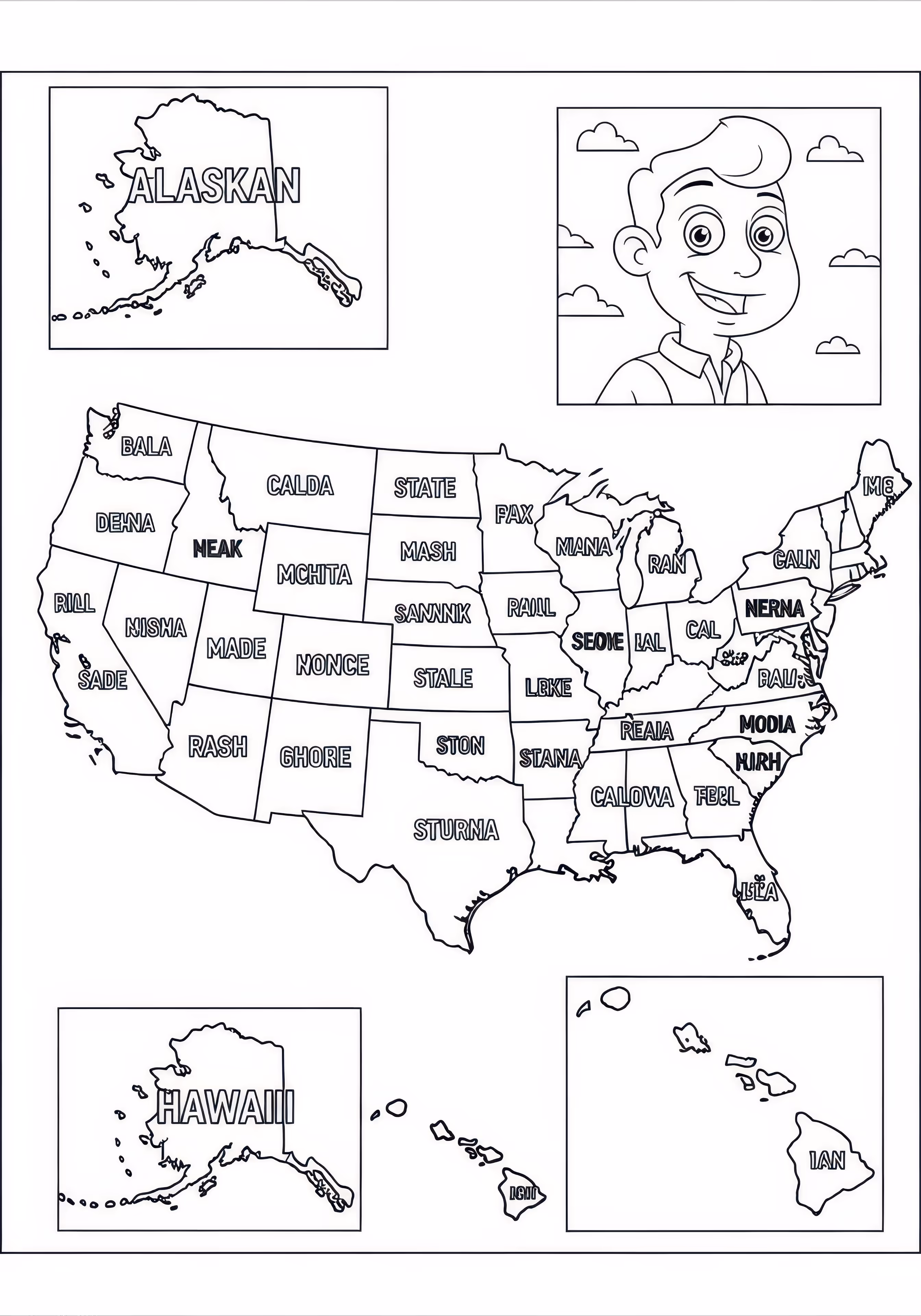Map USA is a free printable coloring page designed for kids in cartoon style. This medium difficulty coloring sheet features medium outlines, perfect for young artists.