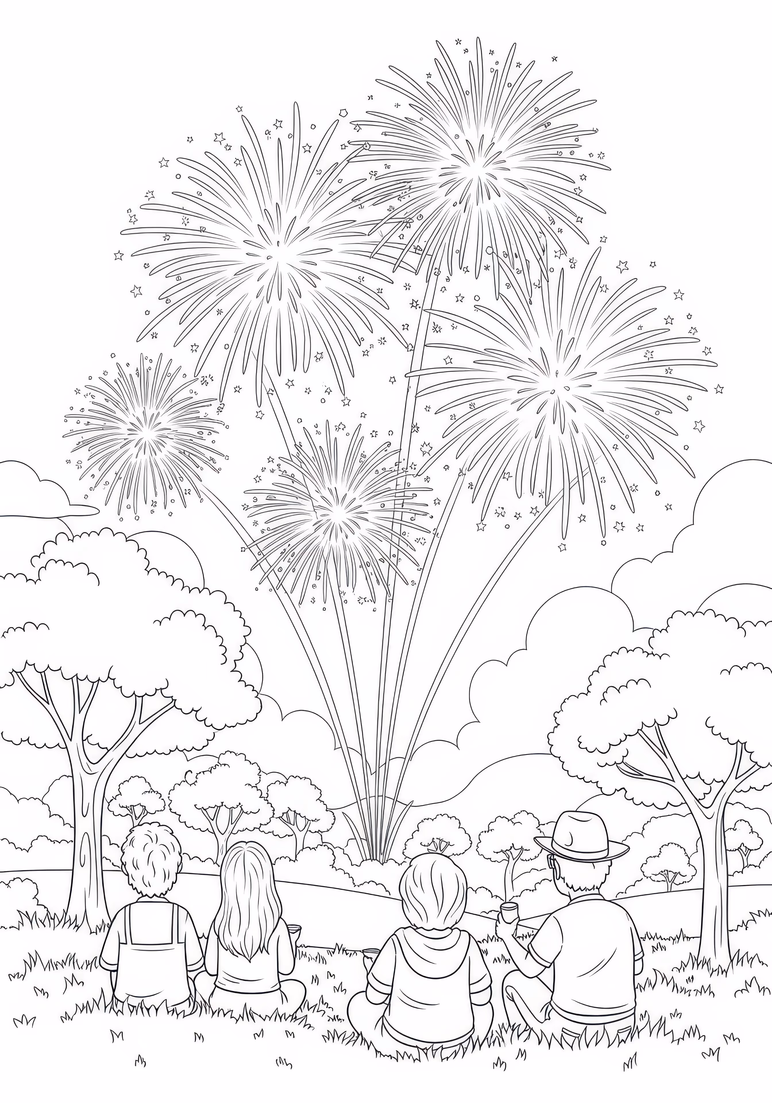 Park Fireworks is a free printable coloring page designed for kids in cartoon style. This medium difficulty coloring sheet features medium outlines, perfect for young artists.