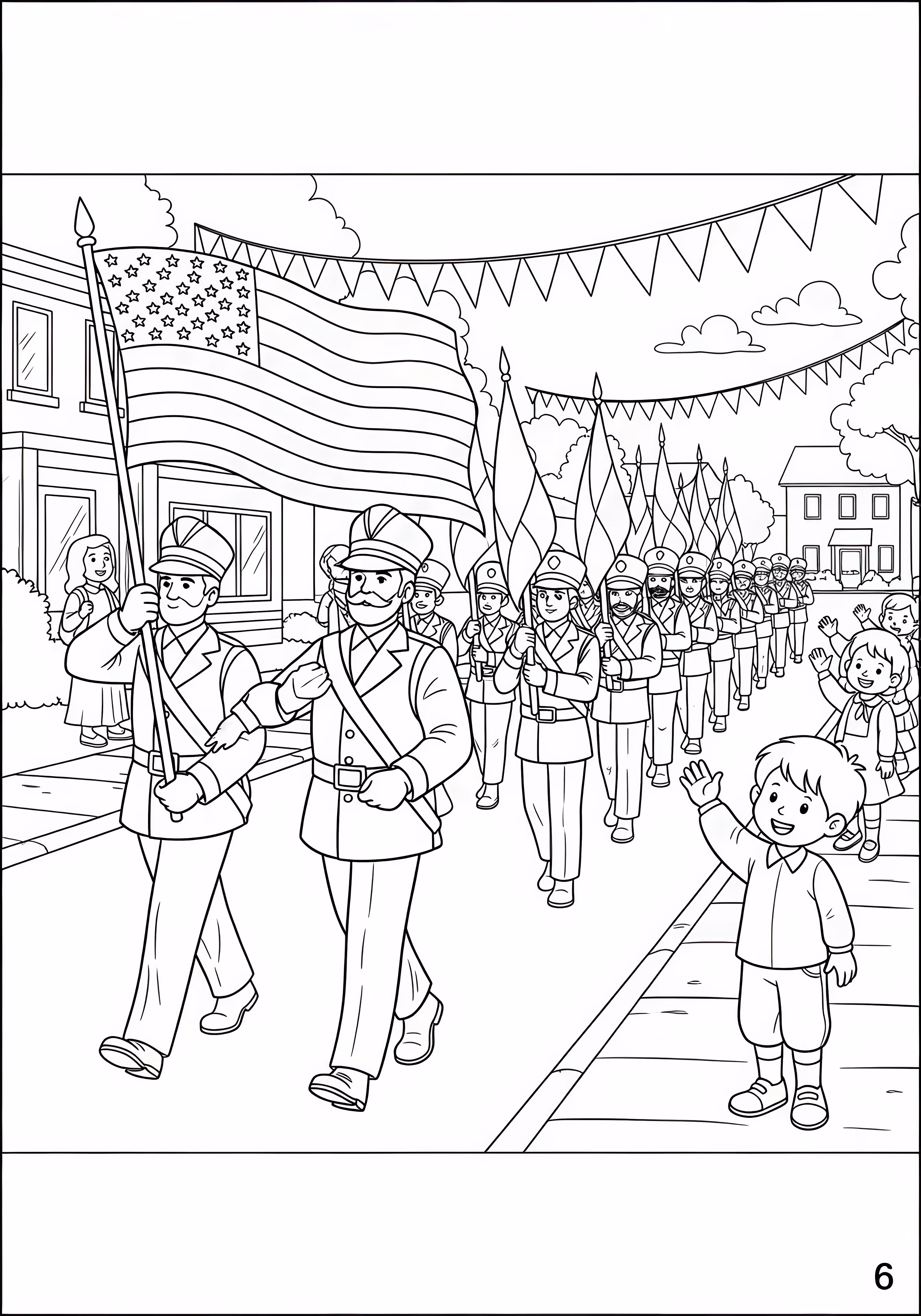 Patriotic Parade is a free printable coloring page designed for kids in scene style. This medium difficulty coloring sheet features medium outlines, perfect for young artists.