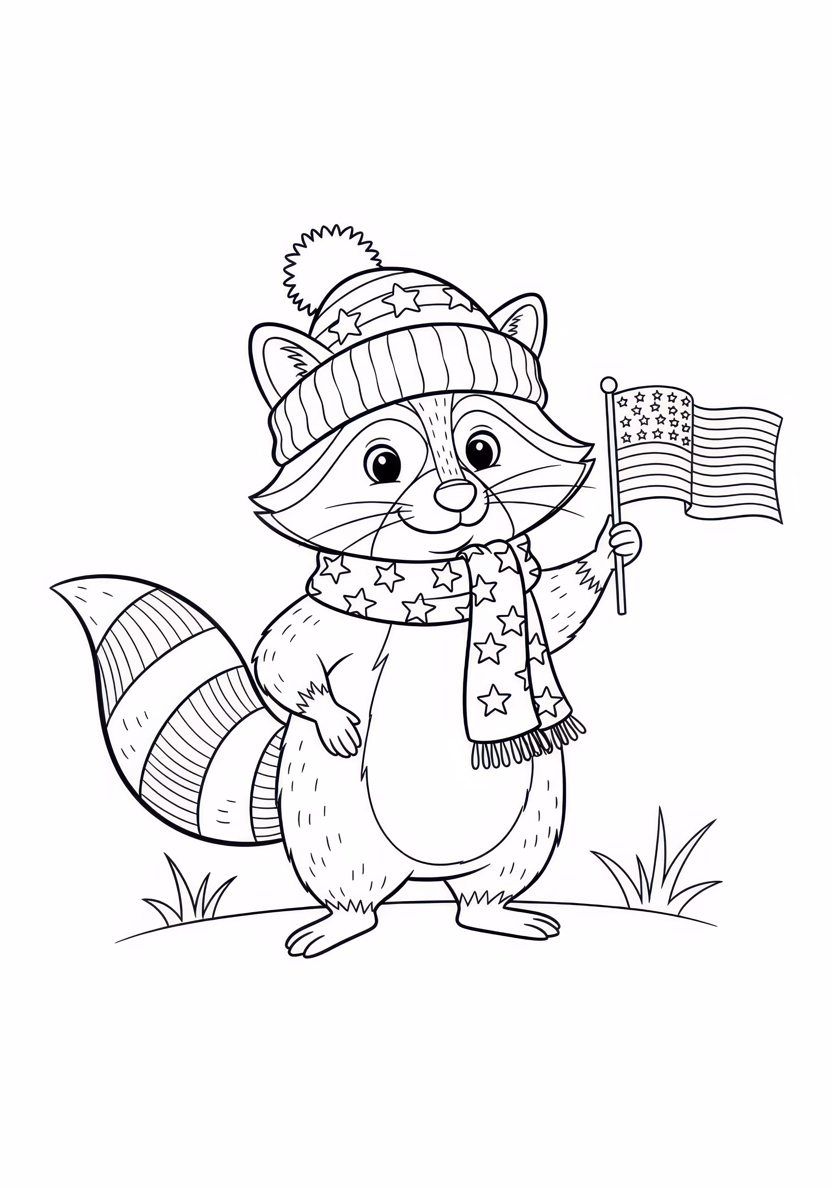 Patriotic Raccoon is a free printable coloring page designed for kids in cartoon style. This medium difficulty coloring sheet features medium outlines, perfect for young artists.