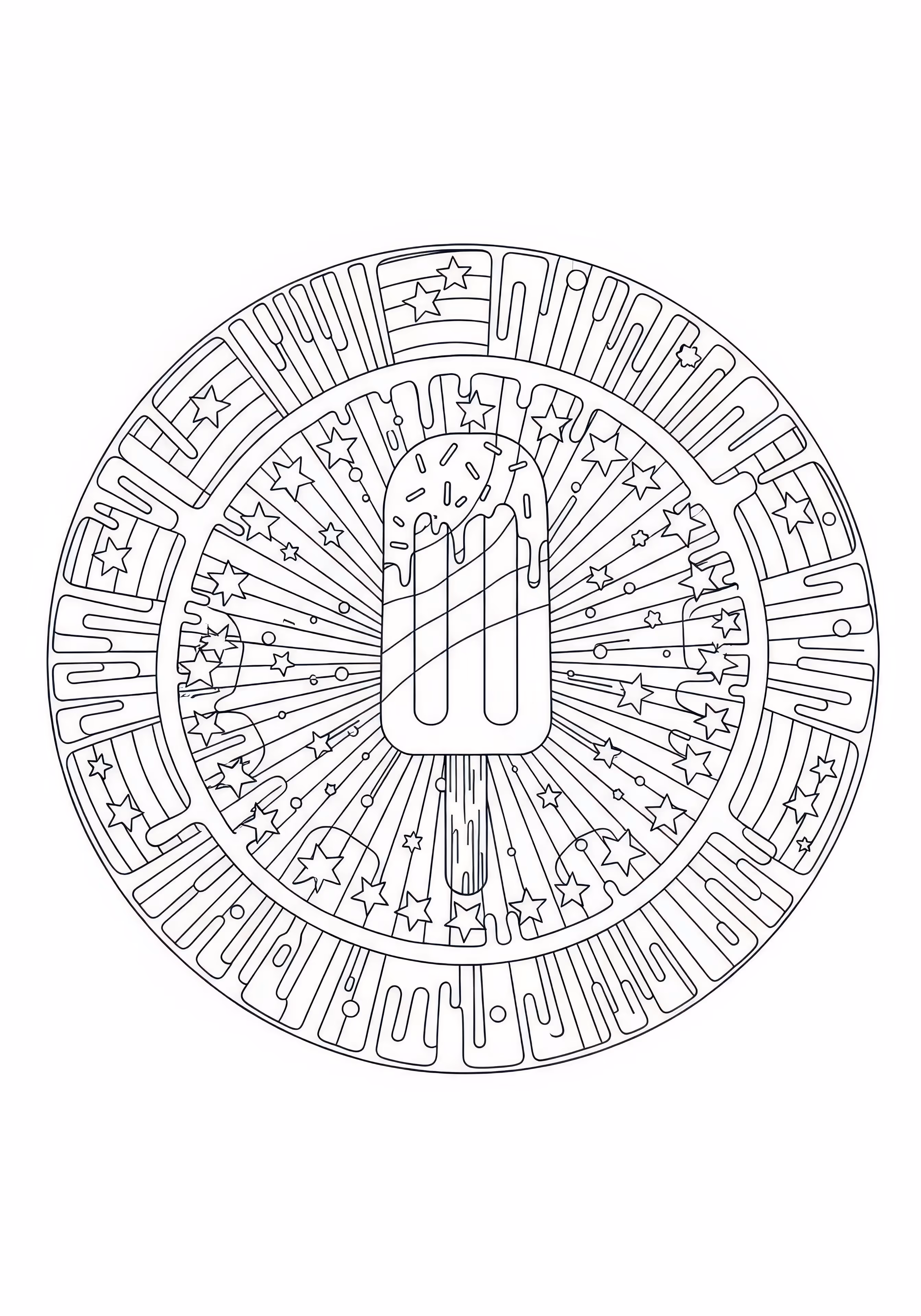Popsicle Mandala is a free printable coloring page designed for adults in mandala style. This very hard difficulty coloring sheet features thin outlines, perfect for young artists.