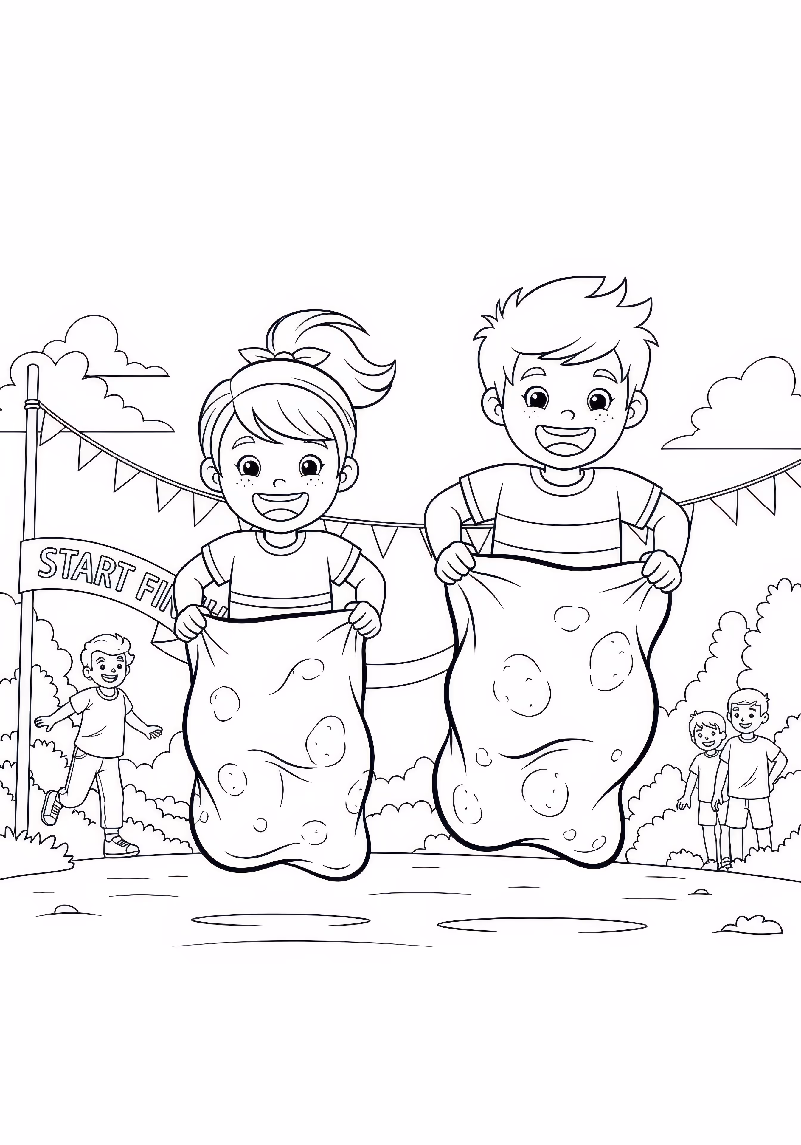 Sack Race is a free printable coloring page designed for kids in scene style. This medium difficulty coloring sheet features medium outlines, perfect for young artists.