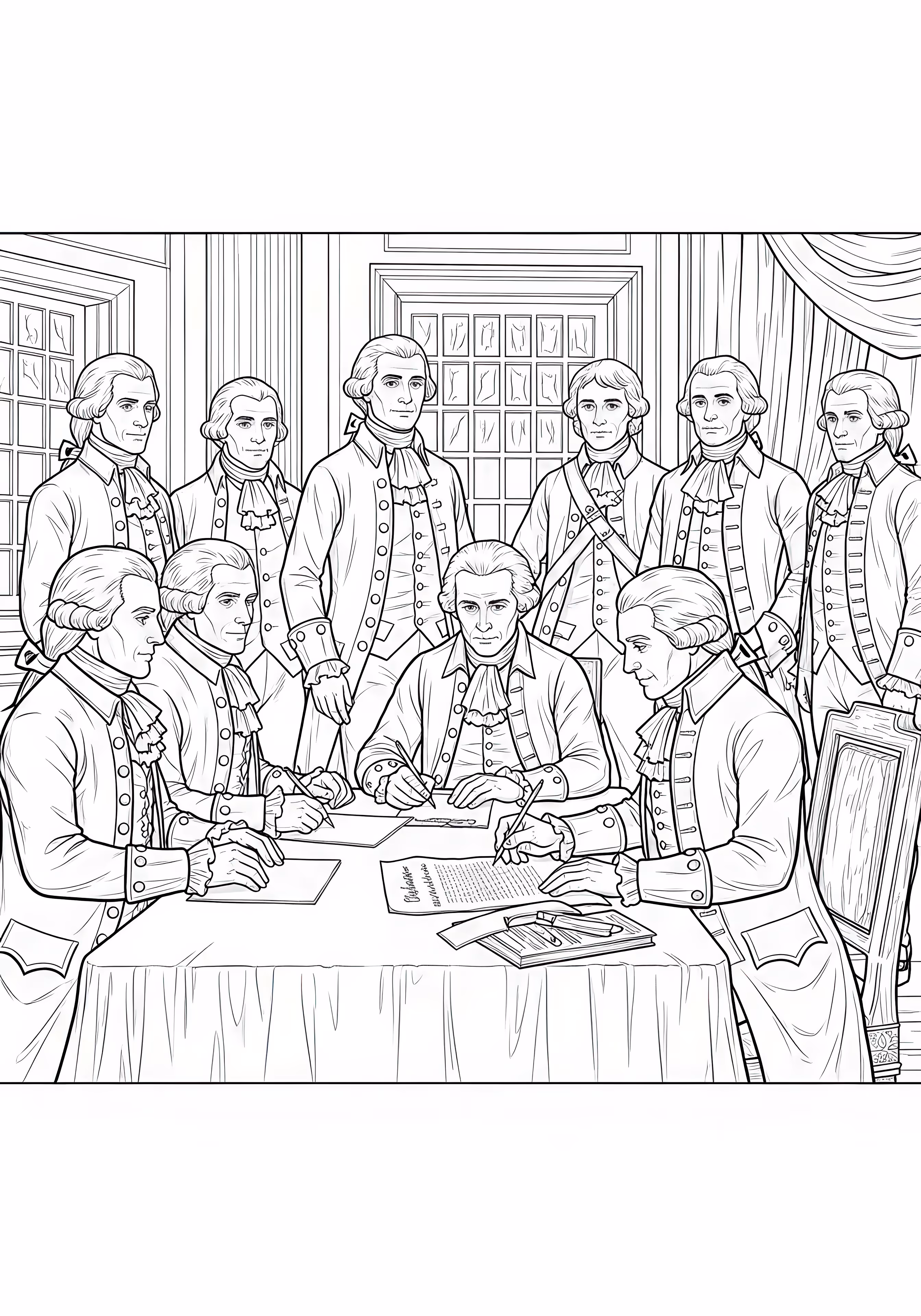 Signing Declaration is a free printable coloring page designed for tweens in historical style. This hard difficulty coloring sheet features medium outlines, perfect for young artists.