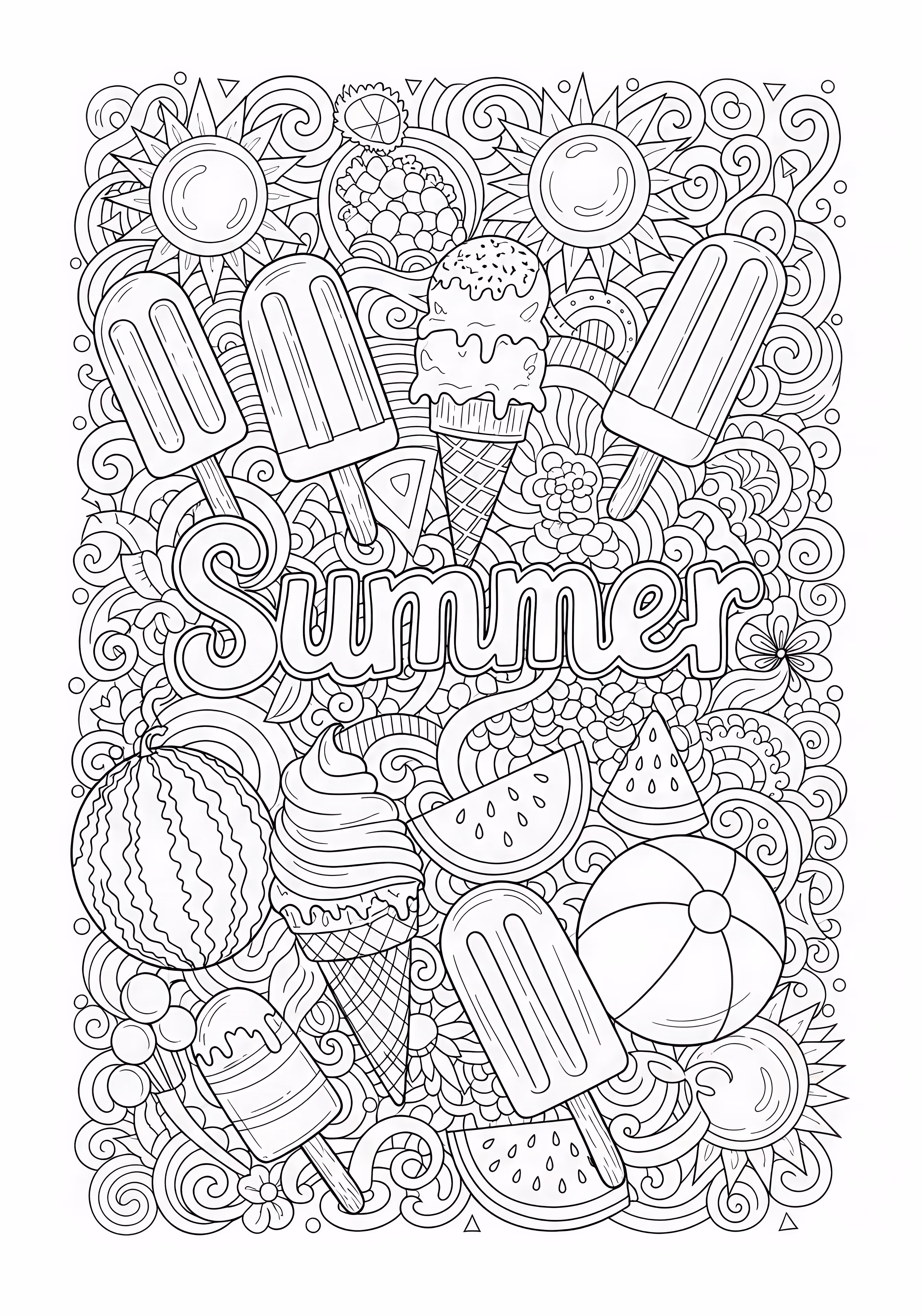 Summer Doodle is a free printable coloring page designed for adults in doodle style. This very hard difficulty coloring sheet features thin outlines, perfect for young artists.