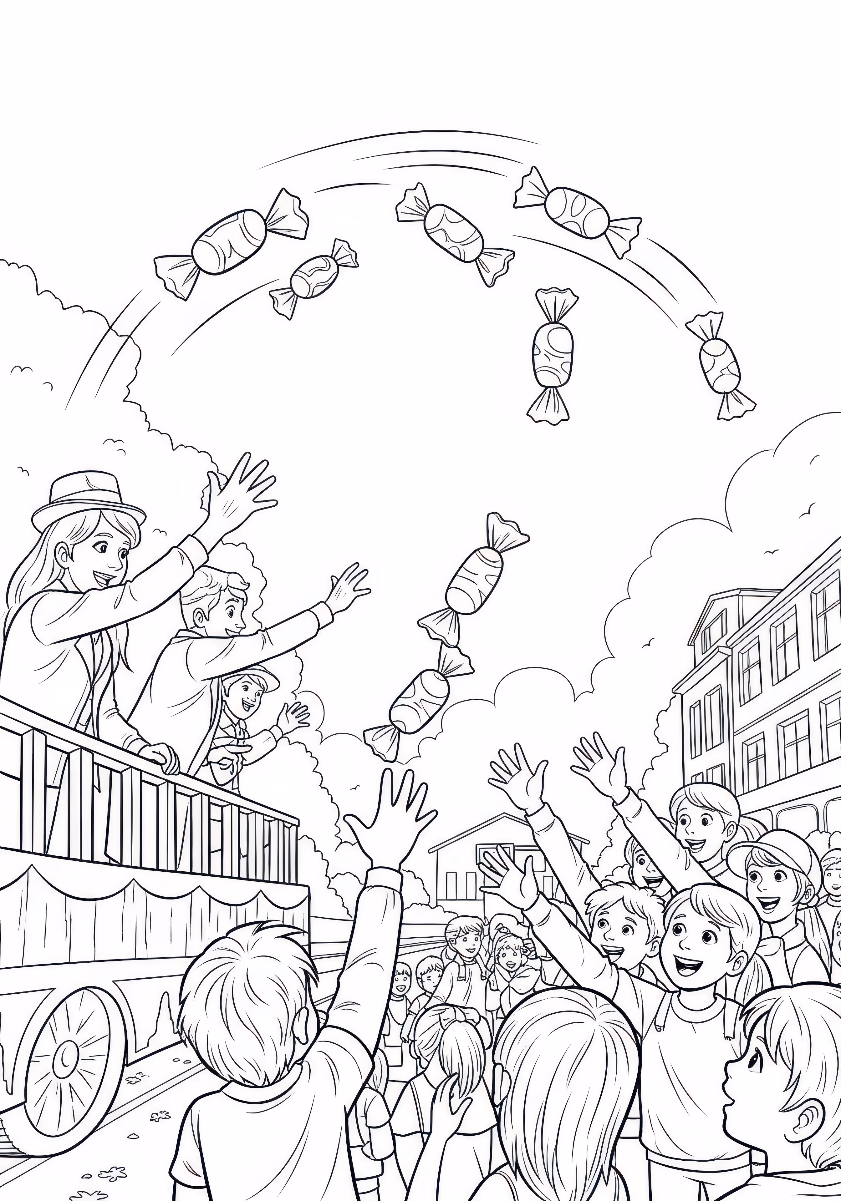 Throwing Candy is a free printable coloring page designed for kids in scene style. This medium difficulty coloring sheet features medium outlines, perfect for young artists.