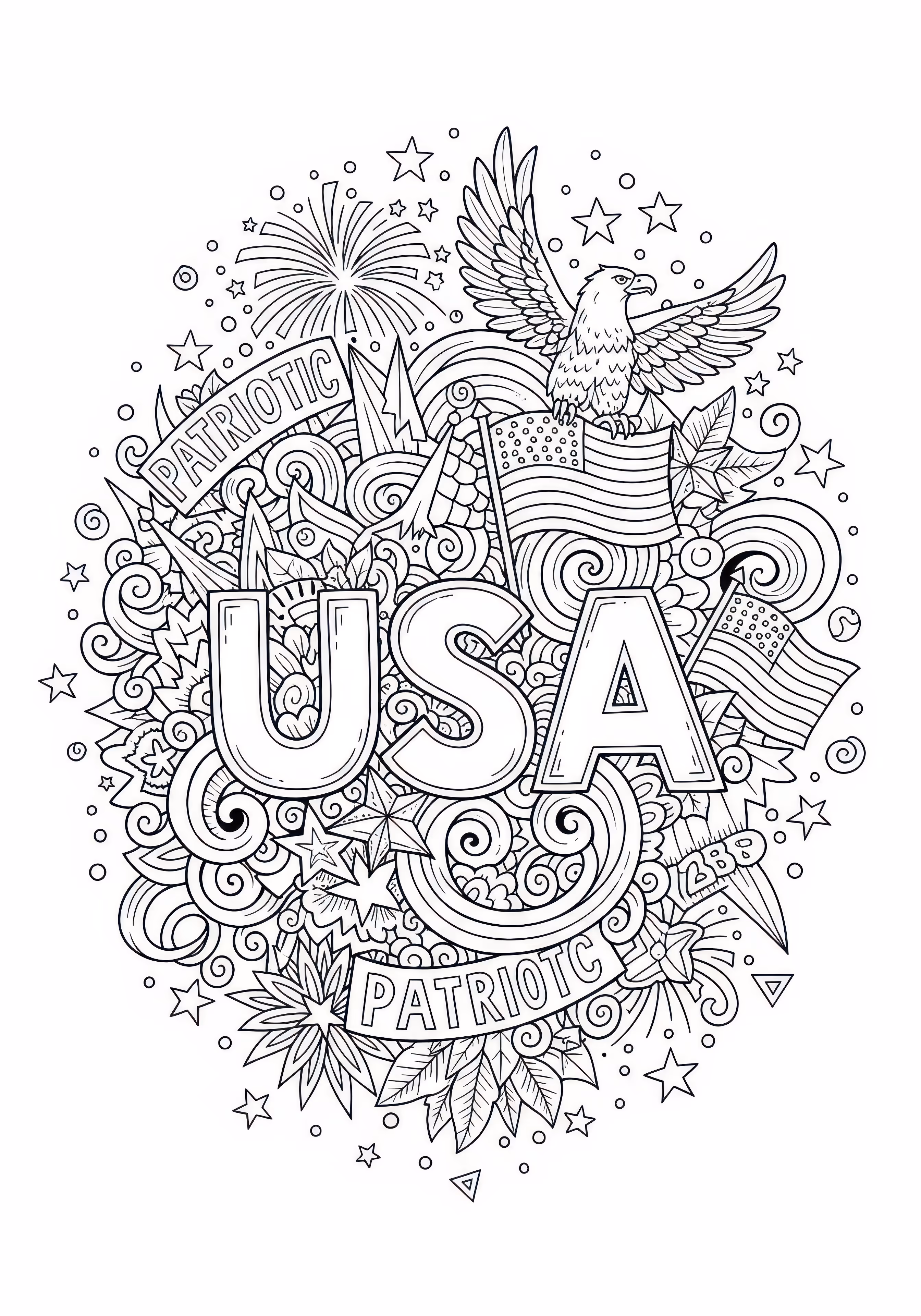 Usa Doodle is a free printable coloring page designed for adults in doodle style. This very hard difficulty coloring sheet features thin outlines, perfect for young artists.