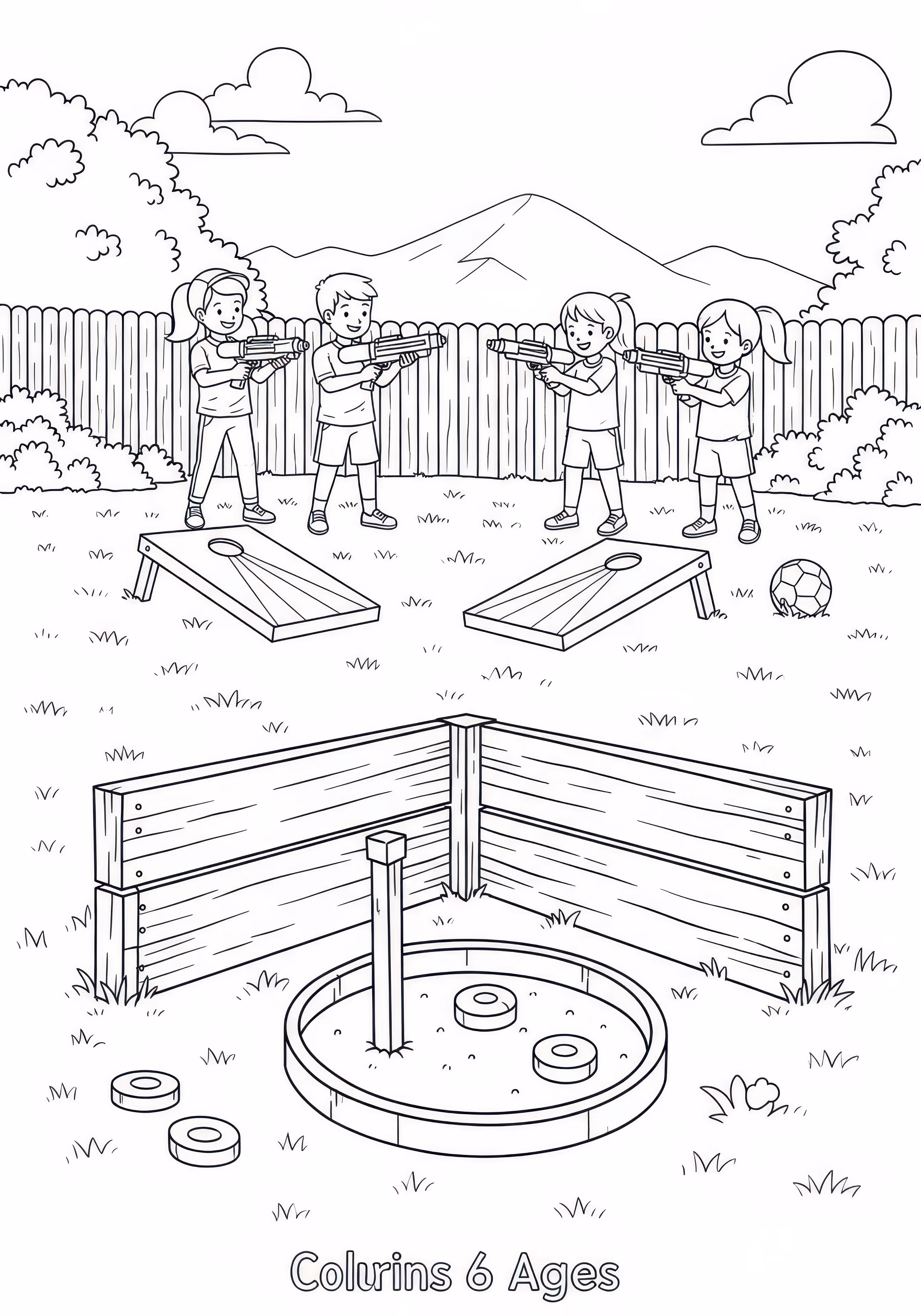 Yard Games is a free printable coloring page designed for kids in scene style. This medium difficulty coloring sheet features medium outlines, perfect for young artists.